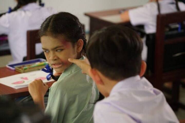 ยัง…ยังไม่พอ ผู้กำกับฯ จัดหลอนขีดสุด!กับซีนตอนที่ “น้องป่าน”ปานชีวา มนต์สิริ สวมบทเป็นวิญญาณเด็กในตุ๊กตาใส่ชุดขาวติดกิ๊บถักผมเปีย ก็ทำออกมาเหมือน “พี่ตุ๊กตา” เป๊ะ! ชวนขนหัวลุกกันทั้งกอง แถมเด็กที่แสดงยังทำสีหน้าขมึงจ้องตาไม่กระพริบ ขนาดตากล้องยังสะท้าน เบาได้เบา..ลูกเอ๊ย!! แล้วก็มาถึงฉากที่ “พอเจตน์” แกล้งดึงผมเปีย “บูรณา” กลางห้องเรียน นอกจากทีมงานจะบิ้วด์อารมณ์ “น้องณิริน” แล้ว “แม่หนิง ปณิตา” ก็เข้ามาช่วยอธิบายความรู้สึกตัวละครให้ลูกสาวเข้าใจอีกรอบ เทรนกันขนาดนี้ พอถ่ายจริง “น้องณิริน” ทำเอาทุกคนอึ้ง กับฉากที่หันขวับแล้วจ้องตาเพื่อนขี้แกล้ง แม่เจ้า…ออร่ามาแรงจริงหนู พอสิ้นเสียงคัทจากผู้กำกับฯ “น้องณิริน” ถึงกับวิ่งไปกอดขอพลังจากคุณแม่