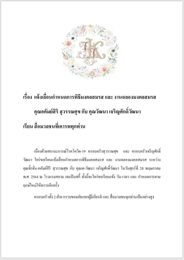 เนื่องด้วยสถานะการณ์โรคโควิด-19 ครอบครัวสุวรรณศุข และ ครอบครัวเจริญศักดิ์วัฒนา ใคร่ขอเรียนแจ้งเลื่อนกำหนดการพิธีมงคลสมรส และ งานฉลองมงคลสมรส ระหว่างคุณจั๊กจั่น–อคัมย์สิริ สุวรรณศุข กับ คุณเค–วัฒนา เจริญศักดิ์วัฒนา ในวันศุกร์ที่ 28 พฤษภาคม พ.ศ. 2564 ณ โรงแรมสยาม เคมปินสกี้ ทั้งนี้จะใคร่ขอเรียนแจ้ง วัน–เวลา และ กำหนดการตามฤกษ์ใหม่ให้ทราบอีกครั้ง