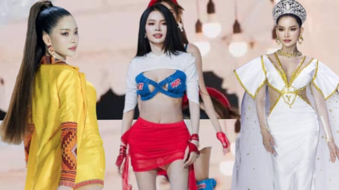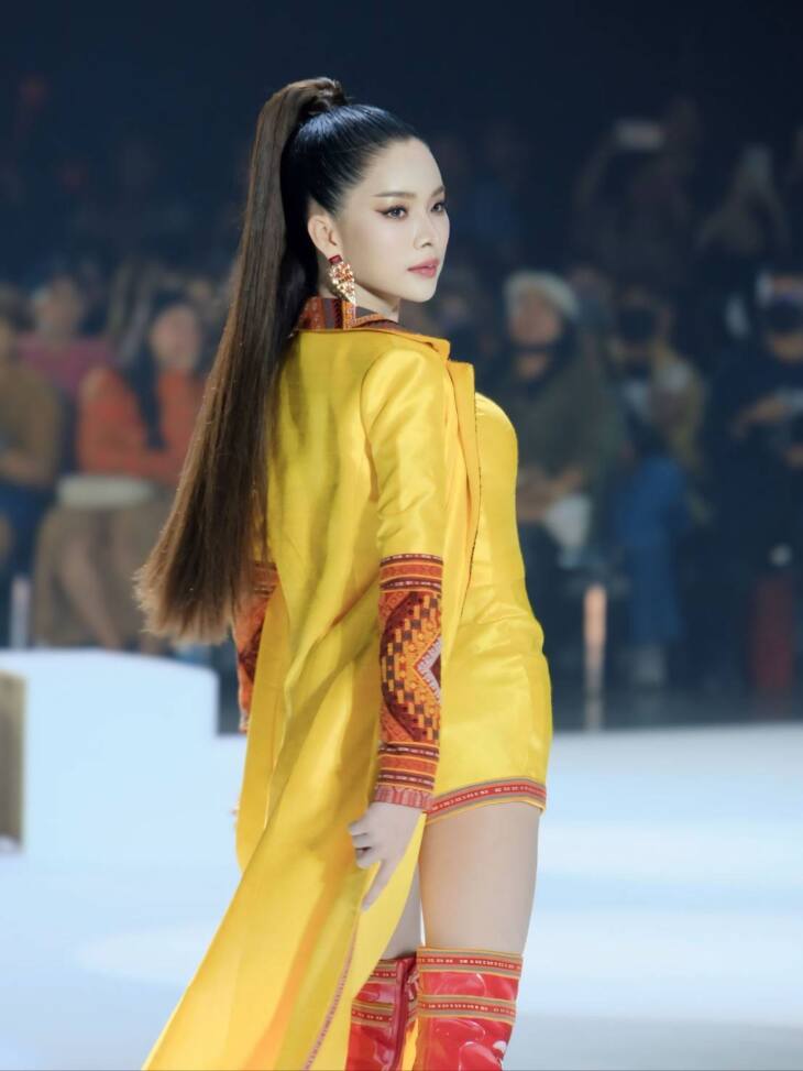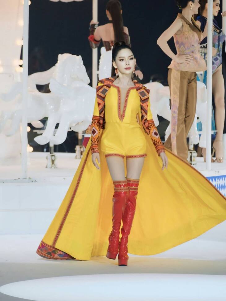 ต่อด้วยแฟชั่นโชว์รอบชุดลายผ้าประจำจังหวัดชัยนาท ซึ่งเป็นผ้าทอลายช่อใบมะขาม สีเหลืองอร่ามตัดด้วยสีแดงตรงปกเสื้อ และรองเท้าบูทยาวสีแดง เดินสับๆ บนเวที บอกเลยว่าจิ๋วแต่แจ๋วมากๆ