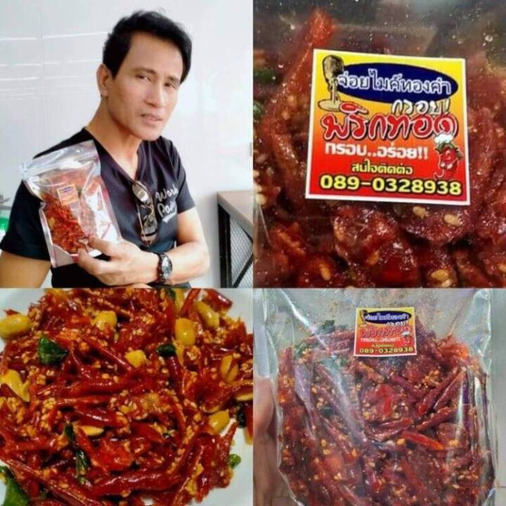 “พี่จ่อยทำพริกทอดกรอบครับ ทำเองครับ เริ่มทำเพราะทำทานเองก่อน ปรับโน่นนี่จนคิดว่ามันอร่อยถูกปาก ได้สูตรตัวเอง ก็ลองทำขายดู กระแสตอบรับดีครับ เพราะเป็นสูตรเราเองด้วย จากแฟนคลับซื้อห่อสองห่อกลายเป็นเพิ่มขึ้นเรื่อยๆ ก็ทำยามว่างครับ มีรสดั้งเดิม รสสไปร์ซี่ รสปาปริก้า ถุงละ79 บาทครับ ค่าส่งแล้วแต่น้ำหนักครับ ฝากอุดหนุนกันได้นะครับ เอาไว้ทานเล่นก็ได้เพลินๆ ทานกับข้าวก็อร่อยครับ สนใจติดต่อที่ FB จ่อย ไมค์ทองคำ ได้เลยครับ”