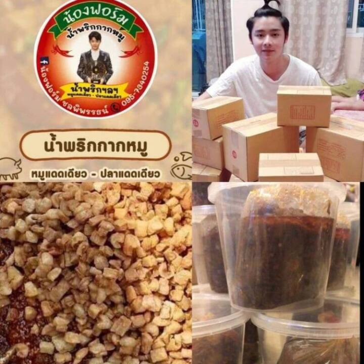 “ช่วงว่างก็จะรับออเดอร์ น้ำพริกกากหมูครับ เป็นน้ำพริกที่ผมชอบ เริ่มจากจัดมิตติ้งทำเลี้ยงแม่ๆแล้วชอบกัน เลยเป็นที่มาในการทำขายครับ คุณแม่ผมทำเองสูตรตัวเอง กระปุกละ ครึ่งกิโล 300 บาท ครับ และ1 กิโล 600 บาทครับ น้ำพริกสูตรทางบ้านผม จะเน้นหมูเยอะมาก ทานกับข้าวเปล่าได้ครับ รสชาติกลางๆไม่ได้เผ็ดมาก กระแสตอบรับดีมากครับ แฟนคลับและแม่ๆอุดหนุน ชิมแล้วบอกต่อ ยอดก็เยอะขึ้นเรื่อยๆครับ สนใจก็สั่งได้ที่ FB น้องฟอร์ม ชลพิพรรธน์ ได้เลยครับ ทำเป็นรอบๆ ติดต่อได้เลยนะครับ”