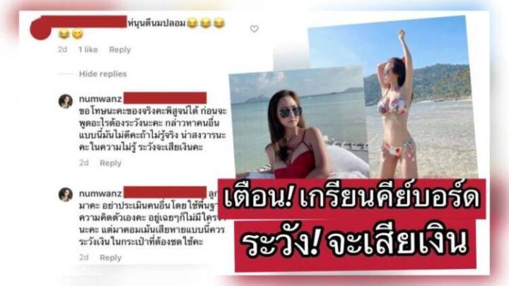 ไฮโซน้ำหวาน-พัสวี พยัคฆบุตร จวกเกรียนคีย์บอร์ดกลางแชท คอมเมนต์ไม่รู้จริงระวังจะเสียเงิน กลายเป็นเรื่องเลยทีเดียว เมื่อมีคนมาคอมเมนต์แรงว่า “หุ่นดีนมปลอม” เมื่อเจ้าตัวเห็นข้อความโพสต์มดังกล่าวเลยเกิดอาการของขึ้นเบาๆ ตอบกลับไปว่า “ขอโทษนะคะของจริงพิสูจน์ได้ ก่อนจะพูดอะไรระวังนะคะกล่าวหาคนอื่นแบบนี้มันไม่ดีนะคะ ถ้าไม่รู้จริง มันน่าสงสารนะคะ ในความไม่รู้ ระวังจะเสียเงินค่ะ”