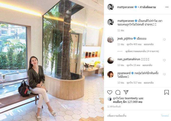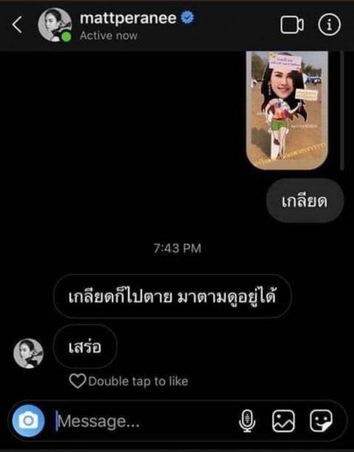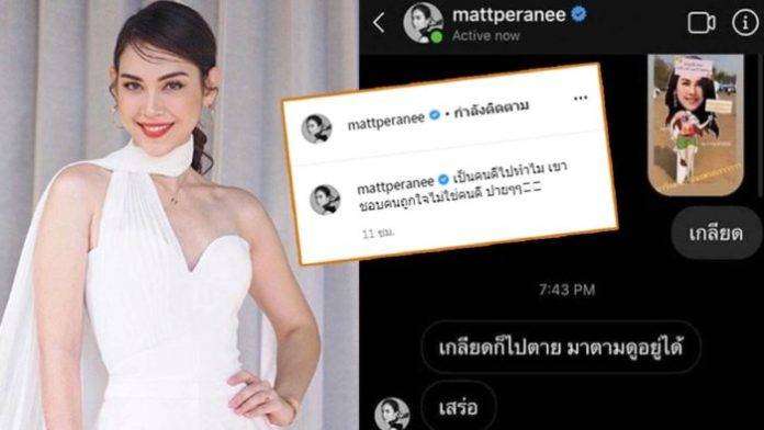 ไม่ว่าจะขยับตัวไปทางไหน โดนกระแสดราม่าอยู่ตลอด สำหรับนางเอกสาวมั่น แมท ภีรนีย์ ที่ล่าสุดกลับมาขึ้นเทรนด์ทวิตเตอร์อีกครั้ง หลังมีเกรียนคีย์บอร์ด DM เข้าไปด่า.. “เกลียด” ใน IG ส่วนตัวของ สาวแมท งานนี้เจ้าตัวไม่ปล่อยให้โดนด่าอยู่ฝ่ายเดียว ด่าสวนกลับทันทีว่า “เกลียดก็ไปตาย….มาตามอยู่ได้” และเม้นต์ต่ออีกว่า “เสร่อ” !!!!!!!!!!!!! จนเป็นกระแสร้อนแรงบนโลกโซเชียลตลอดทั้งวัน หลังจากนั้น สาวแมท ก็โพสรูป พร้อมแคปชั่นใน IG ว่า ”เป็นคนดีไปทำไม เขาชอบคนถูกใจไม่ใช่คนดี ปายๆๆ” โดยมีเหล่าดารา นักแสดง เข้ามาคอมเม้นต์และกดถูกใจกันเพียบจ้าา