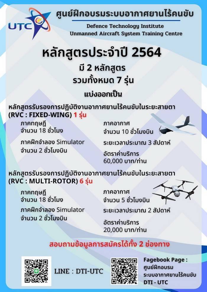 ซึ่งศูนย์ฝึกอบรมนักบินระบบอากาศยานไร้คนขับ ได้รับการรับรองสถาบันฝึกอบรมด้านการบิน (Approved Training Organization : ATO) ตามประกาศข้อบังคับจาก สำนักงานการบินพลเรือนแห่ง ประเทศไทย (กพท.) พร้อมเปิดหลักสูตรการฝึกอบรมนักบินระบบอากาศยานไร้คนขับ 2 หลักสูตร ได้แก่ 1.หลักสูตร Remote Pilot Visual Line of Sight Certificate (RVC) หลักสูตรนักบินระบบอากาศยานไร้คนขับ และ 2.หลักสูตร Instructor Remote Pilot Visual Line of Sight Certificate (IRVC) หลักสูตรครูการบิน ระบบอากาศยานไร้คนขับ สำหรับประชาชนที่สนใจ สามารถดูรายละเอียดเพิ่มเติมได้ที่เฟชบุ๊ก ค้นหาคำว่า “ศูนย์ฝึกอบรมระบบอากาศยานไร้คนขับ DTI – UTC” หรือติดต่อ สถาบันเทคโนโลยีป้องกันประเทศ อาคาร สำนักงานปลัดกระทรวงกลาโหม (แจ้งวัฒนะ) ชั้น 5 เลขที่ 47/433 หมู่ 3 ถนนแจ้งวัฒนะ ตำบลบ้านใหม่ อำเภอปากเกร็ด จังหวัดนนทบุรี11120 โทรศัพท์ : 0 2980 6688 โทรสาร : 0 2980 6199