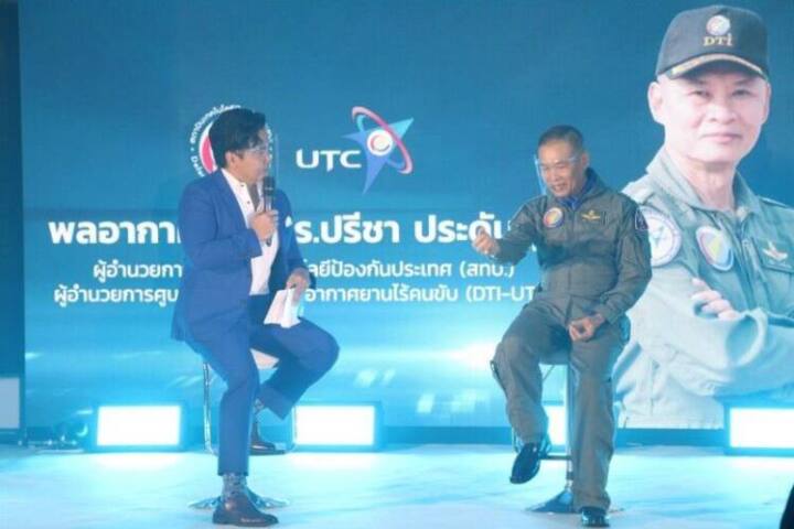 สทป. จับมือ กพท. เปิดตัว DTI-UTC ศูนย์ฝึกอบรมระบบอากาศยานไร้คนขับแห่งแรกของไทย หนึ่งใน ภูมิภาคในอาเชียนภายใต้ซื่องาน “DTI-UTC Grand Opening: Flying into the Future by DTI” ดึงสาว หน้าหวานวิกสามหวานใจหนุ่มมิกค์ ทองระย้า อย่าง โบว์–เมลดา สุศรี พักเรื่องหัวใจสีชมพูขอร่วมแจม คอร์สเรียนบังคับโดรนระยะสั้น ปะทะพิธีกรดังและเจ้าพ่อไอทีอย่าง พีเค–ปิยะวัฒน์ เข็มเพชร แถลงข่าวโดย พลอากาศเอก ดร.ปรีชา ประดับมุข ผู้อำนวยการสถาบันเทคโนโลยีป้องกันประเทศ (สทป.) และควบ ผู้อำนวยการศูนย์ฝึกอบรมระบบอากาศยานไร้คนขับ (Accountable Executive) อีกตำแหน่ง