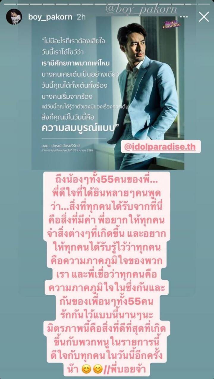 ด้าน ‘บอย – ปกรณ์ ฉัตรบริรักษ์’ พี่ชายใจดี พิธีกรดำเนินรายการ “IDOL PARADISE” หลังรายการต้องยกเลิก การถ่ายทำรอบ Final ได้มีการโพสข้อความผ่าน Instagram Stories ส่วนตัว @boy_pakorn ว่า… “ฝากน้องสาวของผมทั้ง 9 คน ด้วยนะครับ ได้เดบิวต์เป็นศิลปินแล้ว!!!” ตามด้วยข้อความ “ไม่มีอะไรที่เราต้องเสียใจ วันนี้เราได้โชว์ว่า… เรามีศักยภาพมากแค่ไหน บางคนเคยเต้นเป็นอย่างเดียว วันนี้คุณได้ทั้งเต้นทั้งร้อง บางคนเริ่มจากร้อง แต่วันนี้คุณได้รู้ว่าตัวเองมีของเรื่องการเต้น สิ่งที่คุณมีในวันนี้คือ ความสมบูรณ์แบบ”