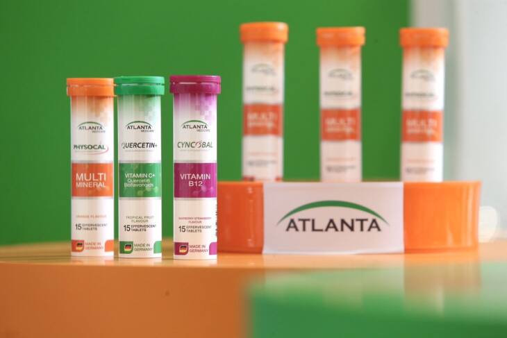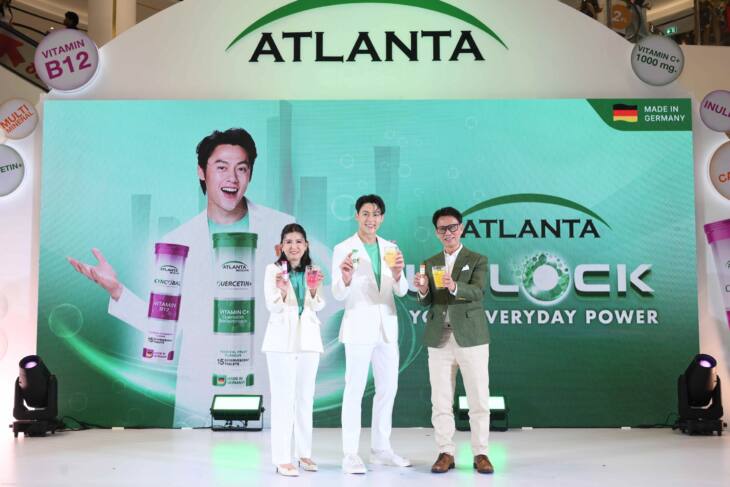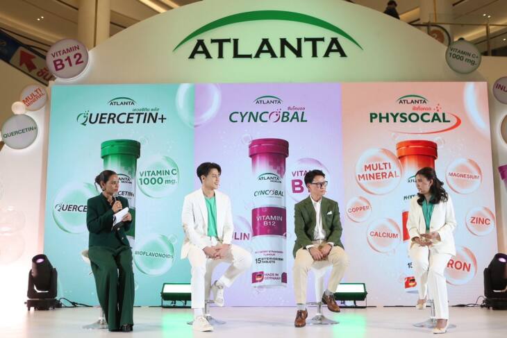 สำหรับผลิตภัณฑ์เสริมอาหาร “วิตามินเม็ดฟู่ดูดซึมเร็ว” แบรนด์แอตแลนต้า เพื่อการดูแลสุขภาพแบบครบทุกมิติ ตอบโจทย์คนยุคใหม่ที่ต้องการทั้งความสะดวกและสุขภาพที่แข็งแรงในทุก ๆ วัน มีให้เลือก 3 สูตร ได้แก่ Quercetin+ รสทรอปิคัลฟรุ๊ต ผสานเควอซิติน วิตามินซี 1,000มล. และไบโอฟลาโวนอยด์จากส้ม ช่วยเสริมภูมิคุ้มกัน บำรุงการทำงานของปอด ทั้งยังช่วยส่งเสริมการปกป้องระบบทางเดินหายใจจากฝุ่น PM 2.5, Cyncobal รสราสเบอร์รี่-สตรอว์เบอร์รี่ อุดมด้วยวิตามินบี12 และอินูลิน มีส่วนช่วยบำรุงระบบประสาทและสมอง ป้องกันโรคอัลไซเมอร์ และอาการอ่อนเพลีย และ Physocal รสส้ม ที่ผสานมัลติ-มิเนอรัล ช่วยรักษาสมดุลของแร่ธาตุในร่างกาย และช่วยปลดล็อกศักยภาพของร่างกายให้พร้อมรับทุกความท้าทายในแต่ละวัน