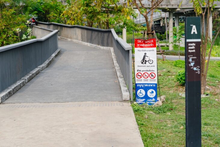 2. การออกแบบเพื่อทุกคน (Universal Design & Inclusion): กทม. ให้ความสำคัญอย่างสูงสุดกับการเข้าถึงพื้นที่ โดยโครงการได้ดำเนินการติดตั้งลิฟต์โดยสาร บริเวณจุดเชื่อมต่อสำคัญ และสร้างทางลาด (Ramp) ขนาดใหญ่ความยาวกว่า 57 เมตร ที่มีความลาดชันเหมาะสมตามมาตรฐานสากล เพื่อให้ผู้พิการที่ใช้รถเข็น ผู้สูงอายุ และครอบครัวที่ใช้รถเข็นเด็ก สามารถขึ้นมาใช้พื้นที่พักผ่อนลอยฟ้าได้อย่างเท่าเทียมกันเป็นครั้งแรก