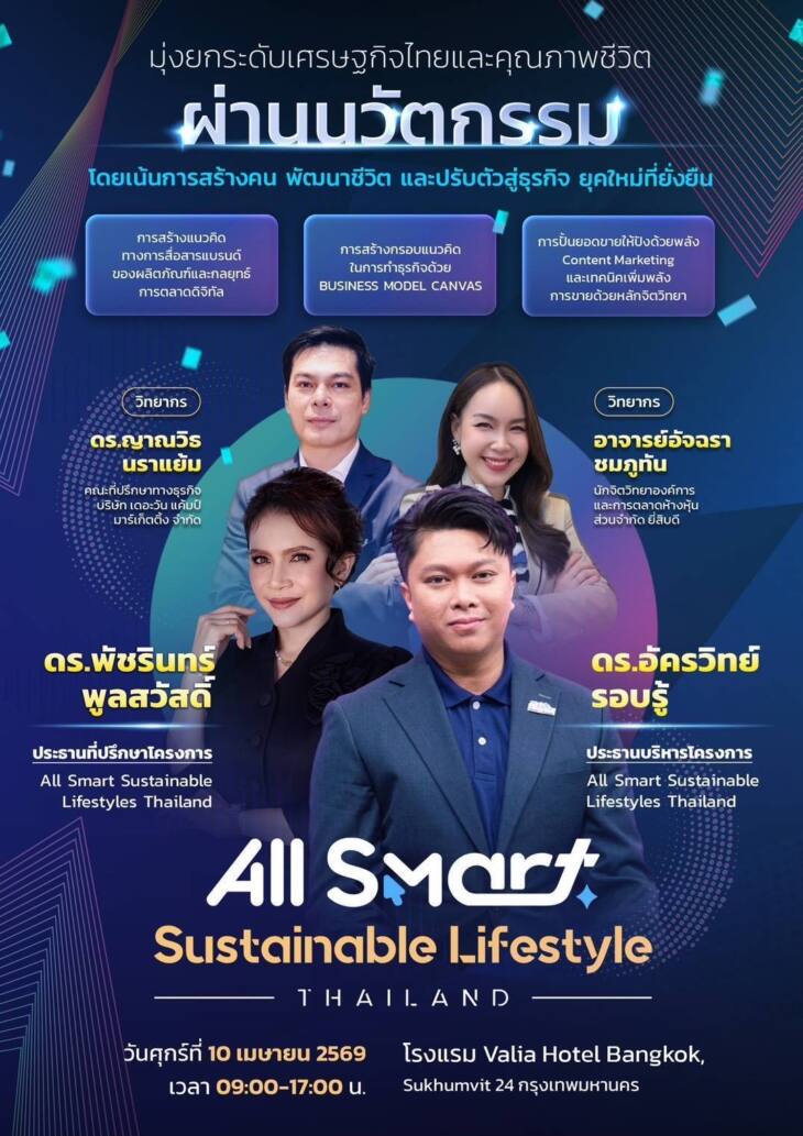 โครงการ All Smart Sustainable Lifestyle นำโดย ดร.อัครวิทย์ รอบรู้ ประธานบริหารโครงการ พร้อมด้วย นายชารีฟ อิทธิฤทธิ์ กรรมการผู้จัดการ พร้อมด้วย ดร.พัชรินทร์ พูลสวัสดิ์ ประธานที่ปรึกษาโครงการ จัดกิจกรรมสัมมนาสุดยิ่งใหญ่ เพื่อมุ่งยกระดับเศรษฐกิจไทย และคุณภาพชีวิต ผ่านนวัตกรรมโดยเน้นการสร้างคน พัฒนาชีวิต และปรับตัวสู่ธุรกิจ ยุคใหม่ที่ยั่งยืน ใน 3 หัวข้อสำคัญ คือ 1.การสร้างแนวคิด ทางการสื่อสารแบรนด์ของผลิตภัณฑ์ และกลยุทธ์การตลาดดิจิทัลจากผู้เชี่ยวชาญระดับประเทศ 2.การสร้างกรอบแนวคิด ในการทำธุรกิจด้วย BUSINESS MODEL CANVAS และ 3. การปั้นยอดขายให้ปังด้วยพลัง CONTENT MARKETING และเทคนิคเพิ่มพลังการขายด้วยหลักจิตวิทยา จากวิทยากรผู้เชี่ยวชาญระดับประเทศ นำโดย ดร.ญาณวิธ ณราแย้ม คณะที่ปรึกษาทางธุรกิจ บริษัท เดอะวัน แค้มป์ มาร์เก็ตติ้ง จำกัด และ อาจารย์อัจฉรา ชมภูทัน นักจิตวิทยาองค์การและการตลาดห้างหุ้นส่วนจำกัด ยี่สิบดี ไปเมื่อวันที่ 10 เม.ย. ที่ผ่านมา โดยมีตัวแทน จากโครงการเข้าร่วมอบรมกันอย่างคับคั่ง ณ โรงแรม Valia Hotel Bangkok