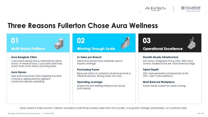 ทั้งนี้ การเชื่อมโยงความร่วมมือในครั้งนี้เกิดขึ้นโดยการสนับสนุนของคุณ Albert Wu จาก 10Bridge ซึ่งเป็น Local Partner ของ Fullerton Thai Private Equity และเป็นผู้มีบทบาทสำคัญในการประสานความร่วมมือระหว่างกองทุน Fullerton กับบริษัท Aura Wellness โดยเป้าหมายของเราคือการผลักดันให้ประเทศไทยเป็น Wellness Destination ของโลกอย่างแท้จริง ด้วยระบบบริหารจัดการที่โปร่งใส และได้มาตรฐานสากลที่เราวางรากฐานไว้ ซึ่งทำให้เราพร้อมรองรับการขยายตัวอย่างเป็นระบบในอนาคต”