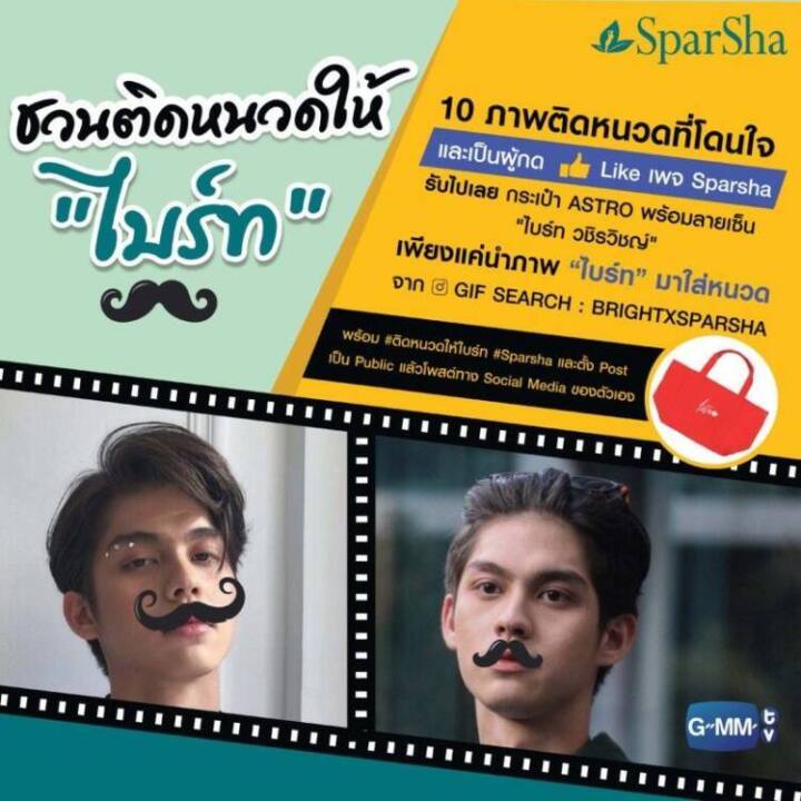 “สปาชา” ชวนแฟนคลับ “ไบร์ท วชิรวิชญ์” ทั่วประเทศ ร่วมสนุกกับกิจกรรม “ติดหนวดให้ไบร์ท” โดยมีกติกาง่าย ๆ เพียงแค่เลือกภาพไบร์ทที่โดนใจมาใส่หนวดสุดกวนด้วย GIF ใน IG Story : BRIGHTXSPARSHA จากนั้นโพสต์ภาพลงบน Facebook, Instagram หรือ Twitter แล้วติดแฮชแทก #ติดหนวดให้ไบร์ท #Sparsha
