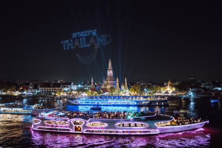 3. วัดอรุณราชวรารามราชวรมหาวิหาร การจัดแสดงภายใต้แนวคิด “อรุณรุ่งสู่ราตรี” ในการจัดแสดง เลเซอร์ ประกอบ Light & Sound โดยผสมผสานเทคโนโลยีของการแสดงโดรนแปรอักษร